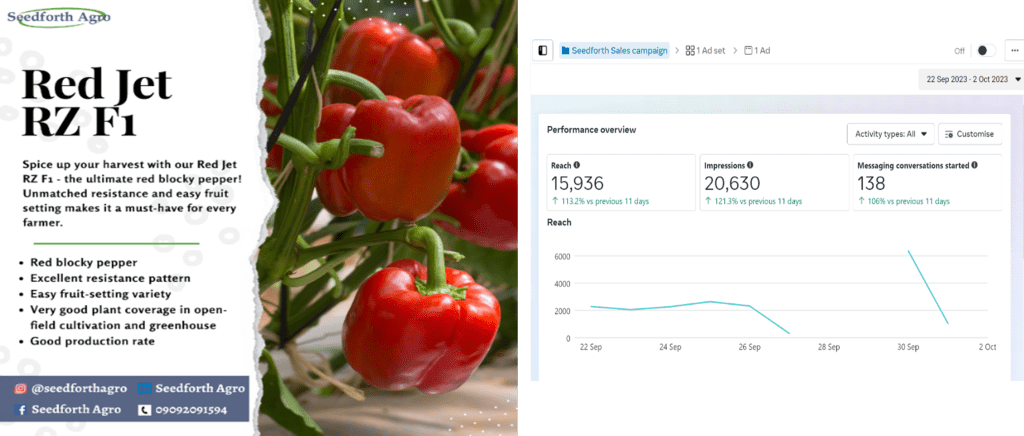 | Image left to right: Social media advert flyer and campaign results. (Image Source: Sahel Consulting, 2023) |